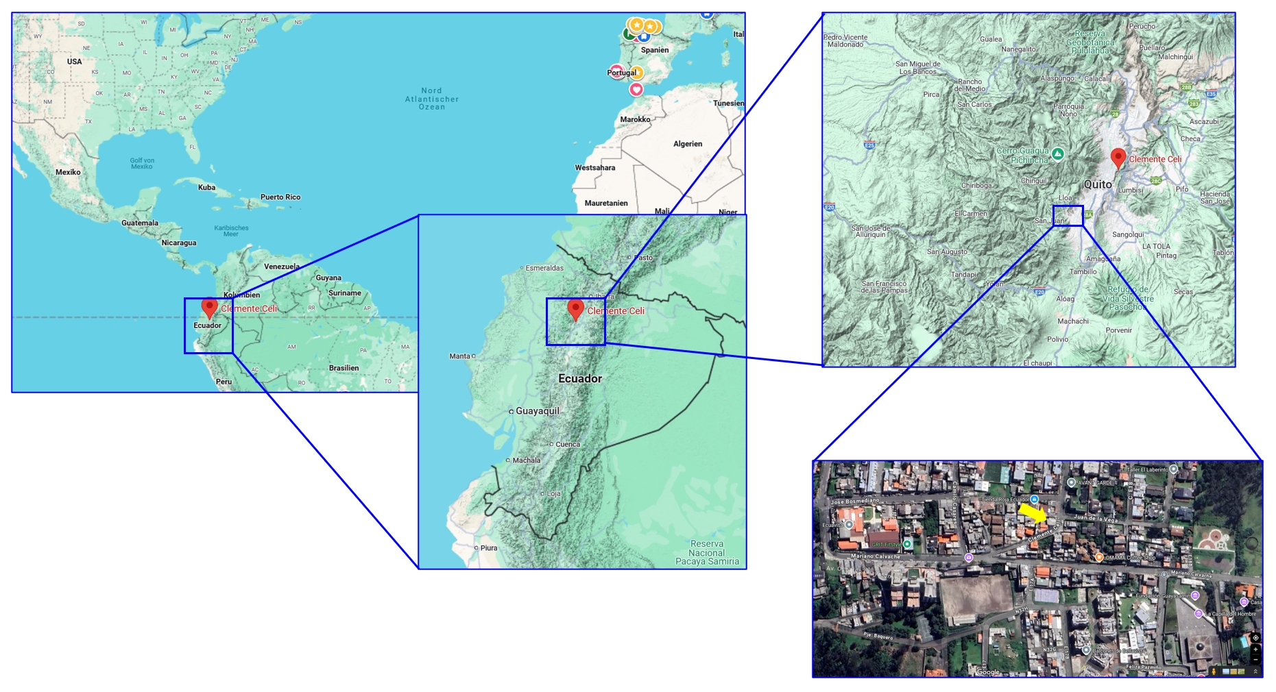 Die Stadt Quito ist die Hauptstadt Ecuadors, nur wenige Kilometer südlich des Äquators in den Vorläufern der Anden in ca. 2850m Höhe. Die Casa del Sol befindet sich in der Calle Clemente Celi auf dem Hügel Bellavista. Dieser ist etwa 5 km von historischen Zentrum entfernt. Wenige 100 Meter oberhalb der Casa del sol befindet sich die berühmte Capilla del Hombre, die das Museum Oswaldo Gyuasamíns beherbergt, des wohl bekanntesten ecuadorianischen Künstlers. Von der Stadt hinauf führt eine steile Strasse durch ein wohlhabendes Viertel, oberhalb sind die Beton und Steinbaracken des Armenviertels.